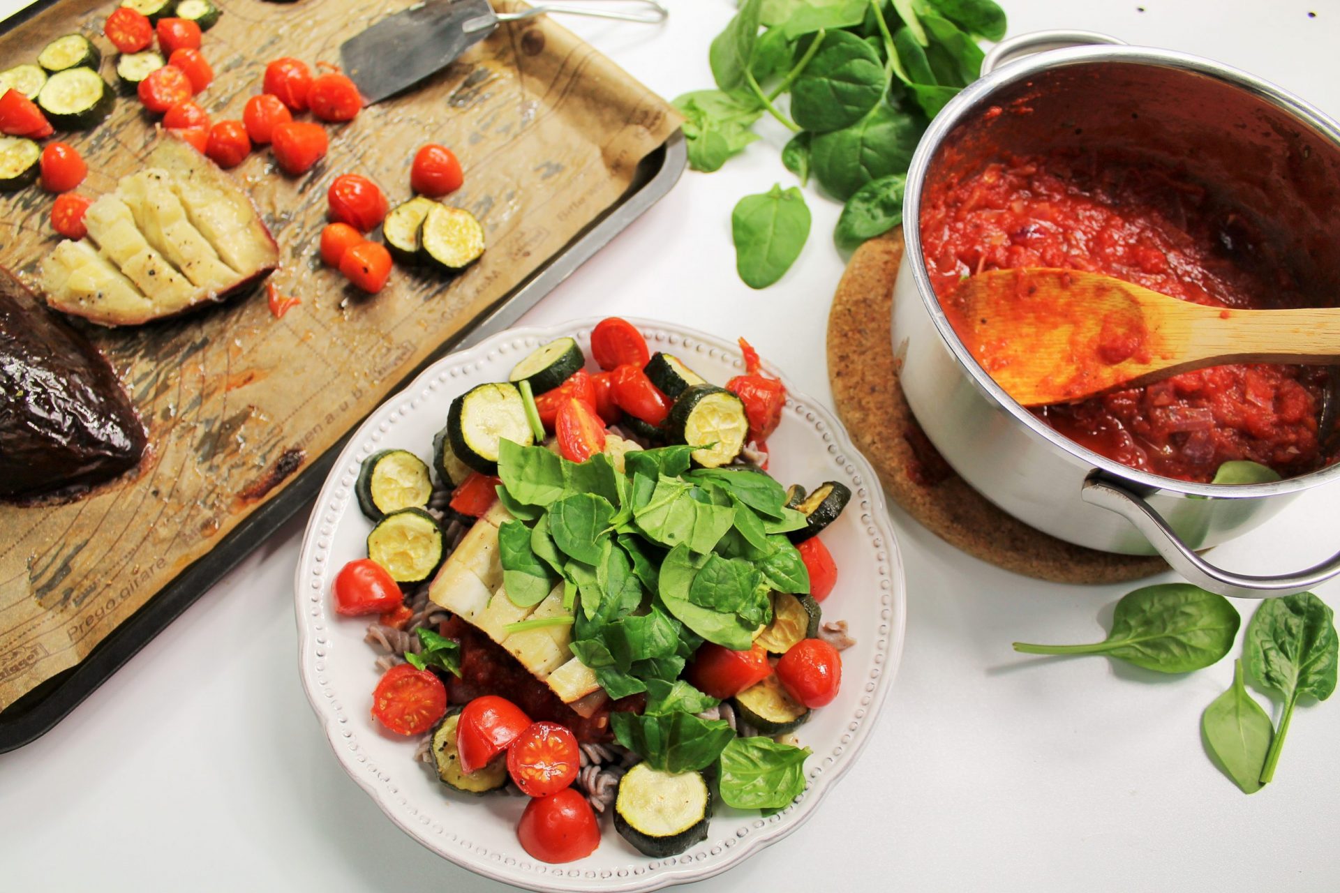 Gelukkig kan je alles leren 🙂 Hieronder het recept voor een heel eenvoudige vegan pasta met geroosterde aubergine, courgette en tomaatjes.