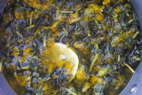 - Breng het water samen met de paardenbloemen en citroen aan de kook. Laat 5 minuten koken en zet het vuur uit. Laat dit mengsel minstens een nacht staan.