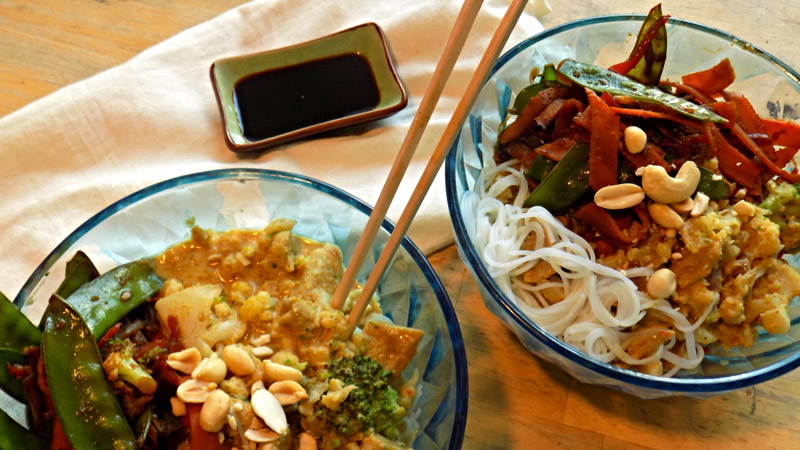 - Neem 2 grote soepkommen en verdeel de rijstnoedels over de bodem. Schep vervolgens flink wat van het kokos-currymengsel over de noedels heen. De roerbakgroentjes voeg je toe als bovenste laag. Werk af met verkruimelde pinda’s en/of cashewnoten en versnipper naar smaak wat verse koriander bovenop je gerecht.
